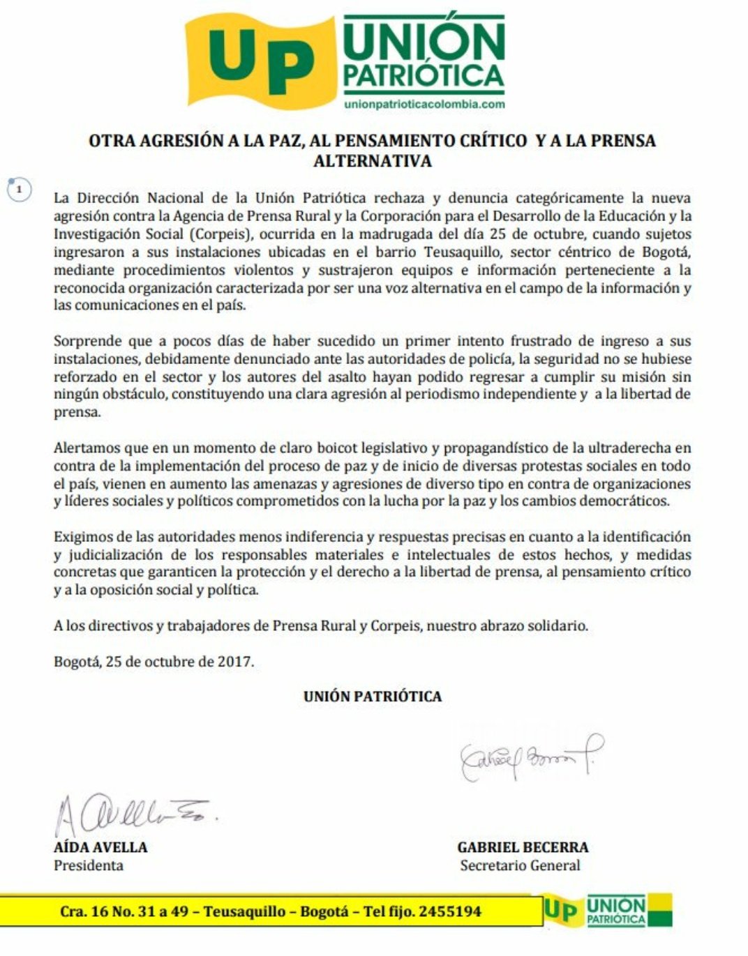 Este comunicado representa un mensaje de solidaridad por parte de nuestros compañeros y compañeras de la UP, a propósito de los problemas de seguridad que se vienen presentando. Como Corporación agradecemos su apoyo y denuncia pública.